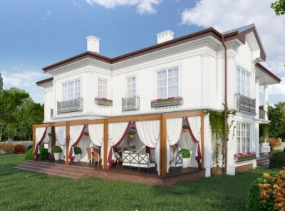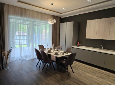 Продажа таунхауса площадью 373 кв. м. Новорижское шоссе, 16 км. от МКАД. Коттеджный поселок Кристалл Истра. Таунхаус выполнен с использованием современных архитектурных и инженерных решений: внешние и внутренние стены выполнены из керамического блока Porotherm 25 с железобетонными перекрытиями, утепленная кровля покрыта гибкой черепицей, фасад и цоколь выполнены из клинкерной плитки с декоративными молдингами.