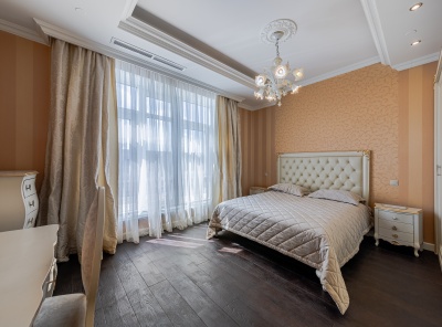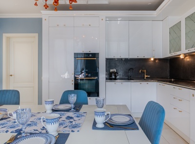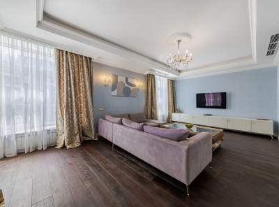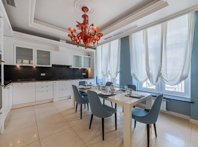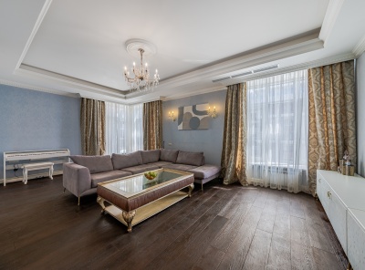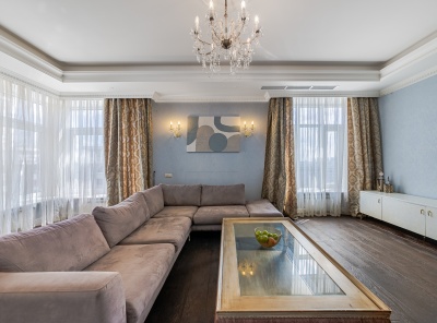 Аренда 4-комнатной квартиры площадью 165 кв.м. Метро Сокол, 12 минут пешком. Чапаевский переулок, дом 3. ЖК Триумф Палас. Стильная кухня оборудована расширенным комплектом встроенной техники, включая посудомоечную машину, духовой шкаф. Для поддержания порядка предусмотрены гардеробная и кладовая. Оптимальный микроклимат обеспечивают теплые полы и сплит-система. Вся необходимая для комфорта мебель. Планировка: кухня-столовая, гостиная, 3 спальни, 2 с/у.