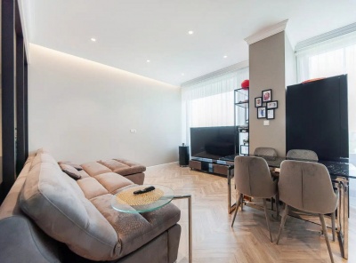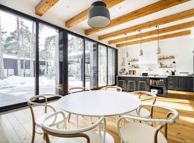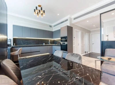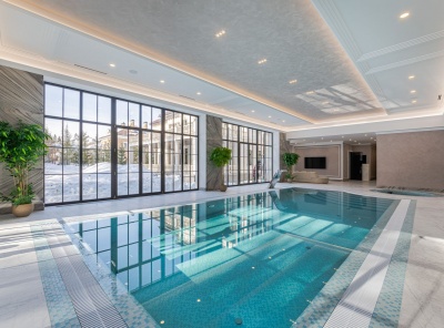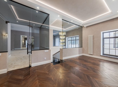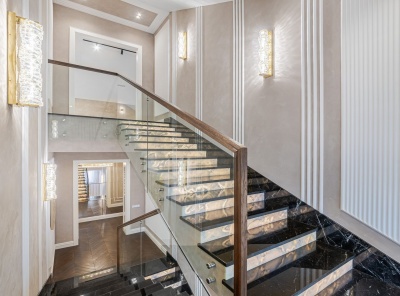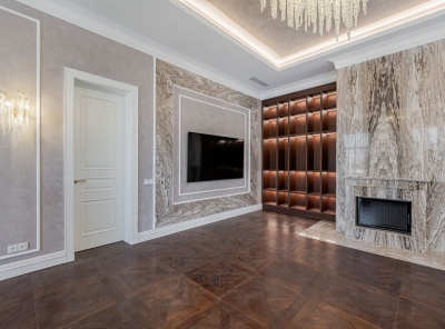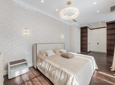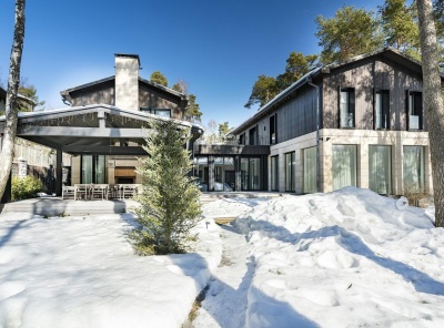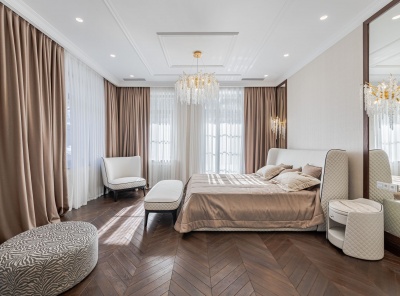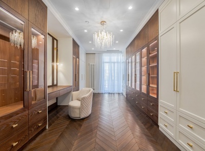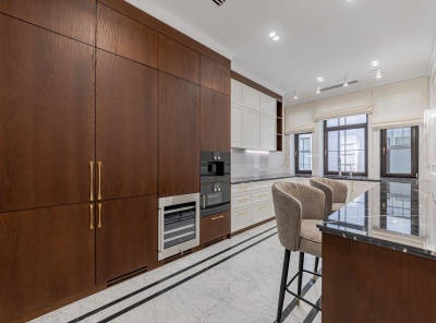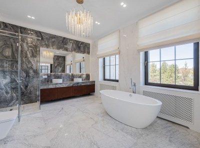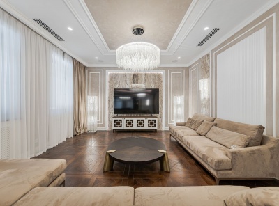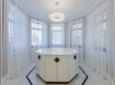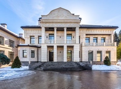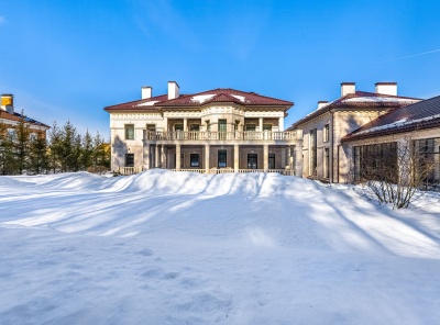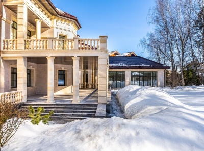 Продажа загородной резиденции у леса общей площадью 860 кв.м. Новорижское шоссе, 23 км от МКАД. Коттеджный поселок Риверсайд. Дом построен в 2 этажа из кирпича. Отделка выполнена с применением самых дорогих материалов. Натуральный мрамор и дубовый паркет, оникс, гипсовая лепнина, венецианская штукатурка. Роскошный интерьер исполнен в светлых тонах, дополнен стильной мебелью и изысканными предметами декора. Функциональная кухня укомплектована встроенной современной техникой Gaggenau.
