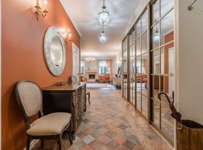 Продажа загородного дома общей площадью 440 кв.м. Коттеджный поселок Гринфилд. Новорижское шоссе, 23 км от МКАД. Дом построен в классическом стиле в 2 этажа, под ключ. Выполнена качественная отделка с использованием дорогих отделочных материалов: двери массив, пол мрамор и паркет из ценных пород дерева, ванные комнаты отделаны натуральным камнем, дорогая сантехника, итальянская кухня, центральная система кондиционирования, теплые полы. Элементы террасы отделаны итальянским песчанником.