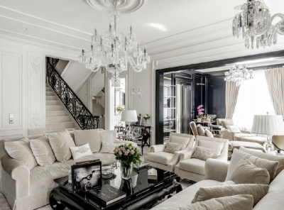 Предлагается в продажу роскошный 3-х уровневый пентхаус площадью 425 квадратных метров с открытой террасой. Пентхаус полностью меблирован и оборудован: посуда, кухонная техника, текстиль, декор и аксессуары от премиальных мировых брендов.Проект в жилом комплексе Доминион победил сразу в 2-х номинациях International Property Awards: Лучший проект по реновации пространства и Лучший проект по дизайну интерьера.В оформлении гостиной преобладают нейтральные, пастельные тона.
