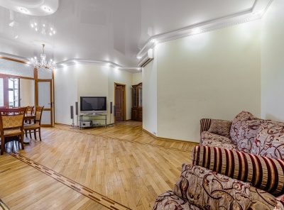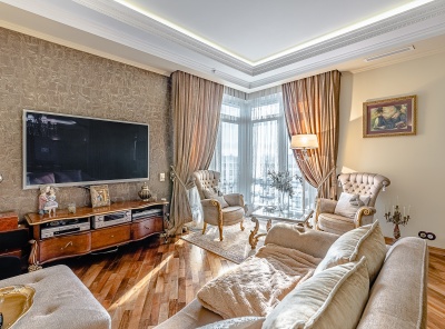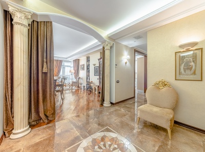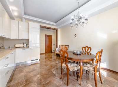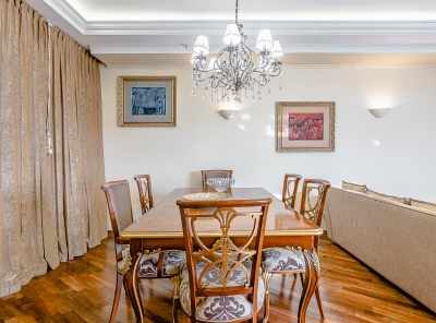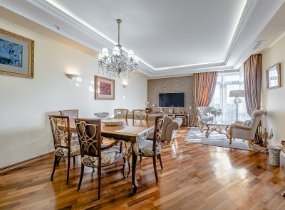 Аренда 3-комнатной квартиры площадью 148 кв.м. Метро Сокол, 1 минута пешком. Ленинградский проспект, дом 76к1. ЖК Соколиное гнездо. Ремонт выполнен в классическом стиле. Квартира полностью меблирована, кроме гостиной. Имеется вся необходимая бытовая техника, включая кондиционеры. Окна выходят на улицу. Прекрасный панорамный вид. Есть лоджия.Удобная планировка: просторная гостиная, 2 спальни, кухня с встроенным гарнитуром, ванная комната с ванной и душевой, гостевой санузел, гардеробная комната.