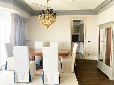 Аренда 4-комнатных апартаментов площадью 202 кв.м. Метро Деловой Центр, 3 минуты пешком, адрес: 1-ый Красногвардейский проезд, д.15 ЖК Меркурий Таэур. Апартаменты полностью меблированы, ремонт выполнен в современном стиле, установлена вся необходимая бытовая техника. Окна выходят на гостиницу Украина и на башни Москва-Сити.Планировка: кухня, гостиная, 3 спальни, 3 с/у, гардеробные комнаты.