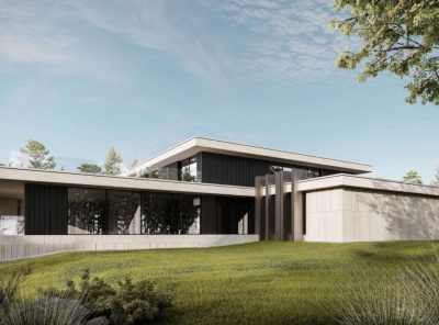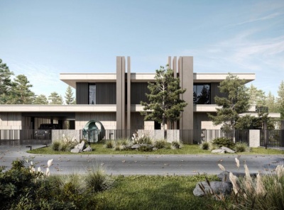 Продажа загородного дома общей площадью 595 кв.м. Новорижское шоссе, 17 км от МКАД. Коттеджный поселок Райт Хиллс. Этот современный дом впечатляет сочетанием лаконичной архитектуры и тёплой натуральности материалов: строгие геометрические формы фасада подчеркнуты гладкой белой штукатуркой, вертикальной облицовкой из дерева и вставками из камня, создающими гармоничный, но выразительный контраст.