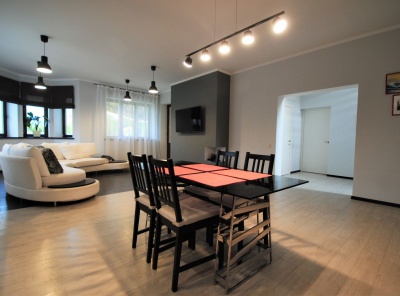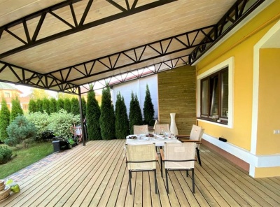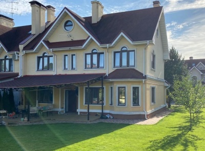 Аренда загородного дома (дуплекс) площадью 283 кв.м. Новорижское шоссе, 32 км от МКАД. Коттеджный поселок Крона. Дуплекс построен из кирпича в английском стиле. В доме есть все необходимое для комфортного проживания большой семьи. Вся бытовая техника и мебель в наличии, высокоскоростной интернет. На участке 9 соток с ландшафтным дизайном высажены плодовые деревья. Паркинг на 2 м/м.