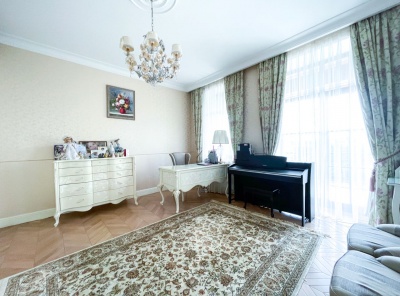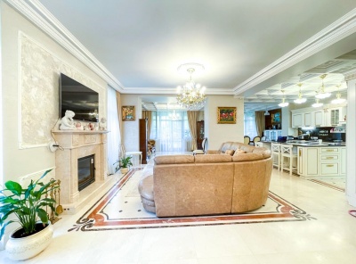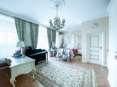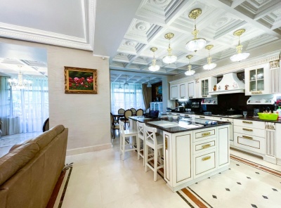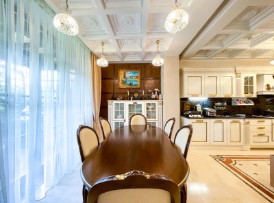 Аренда загородного дома общей площадью 700 кв.м. Рублево-Успенское шоссе, 8 км от МКАД. Коттеджный поселок Лес ДСК. Комфортабельный и стильный коттедж для постоянного проживания. На первом этаже полы белый мрамор и малахит. Подоконники белый мрамор. Полы в спальне 2-го этажа с водяным подогревом. Покрытие керамическая плитка под дерево. Во всех санузлах, на лестничных площадках, гостиной, столовой, кухне, зимнем саду, кинозале, бассейне полы также выполнены по технологии теплый пол, что обеспечивает комфорт и уют даже в сильные морозы.