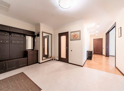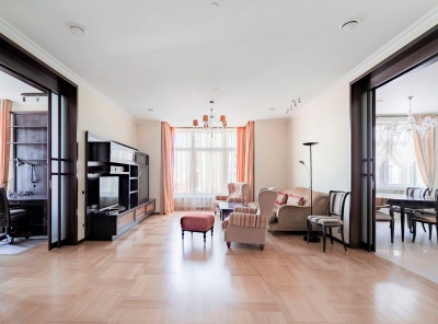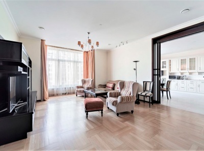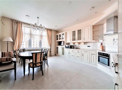 Аренда 5-комнатной квартиры площадью 206 кв.м. Метро Сокол, 12 минут пешком. Чапаевский переулок, дом 3. ЖК Триумф Палас. Светлая, уютная, тихая квартира с отделкой в стиле современная классика, которая выполнена из высококачественных экологичных материалов. Полы - массив дуба. Мебель - Италия. На кухне гарнитур со встроенными шкафами, есть вся необходимая бытовая техника (Miele, Kuppersbusch). Во всех комнатах блоки регулирования системы кондиционирования. Вид в тихий двор. 2 м/м входят в стоимость.