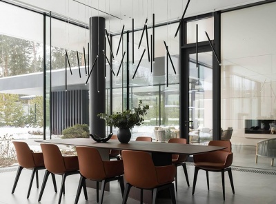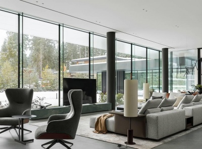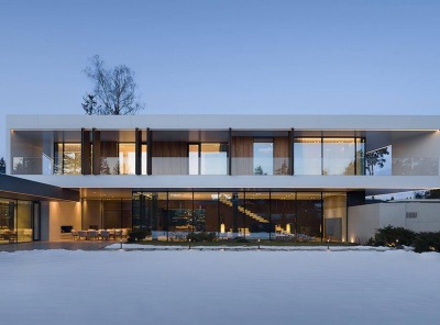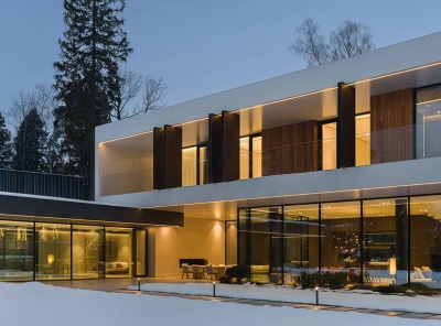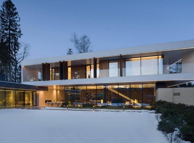 Продажа загородного дома площадью 920 кв.м. Рублево-Успенское шоссе, 21 км от МКАД. Коттеджный поселок Ново-Успенский. Дом построен под ключ. Вентилируемый фасад облицован крупноформатным керамогранитом Laminam, Cotte d'Este и декорирован термоясенем и подсветкой. Установлены панорамные окна на базе алюминиевого профиля Schüco и стеклопакетов AGC со стеклом триплекс. Современный интерьер разработан бюро SL Project, в отделке использованы натуральный камень, дерево и металл, керамика Cielo, сантехника Gessi, Antonio Luppi, Fantini. Лесной участок 20 соток.