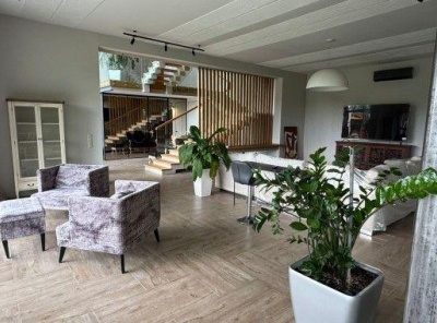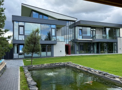 Аренда загородного дома площадью 770 кв.м. Новорижское шоссе, 9 км от МКАД. Коттеджный поселок Никольская Слобода. Коттедж построен в 2 этажа, под ключ. Современный дом в стиле хай-тек с выразительной архитектурой и панорамным остеклением. Фасад выполнен в сочетании светлого камня и темных металлических элементов, что придает зданию элегантность и строгость. Большие окна от пола до потолка обеспечивают максимум естественного света и создают ощущение открытости и гармонии с природой.